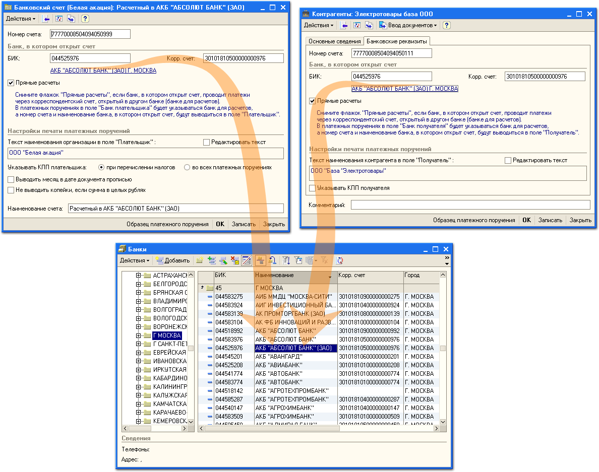 Для ввода банковских реквизитов используется встроенный классификатор банков Российской Федерации. Достаточно указать БИК, и все реквизиты банка подставятся автоматически.