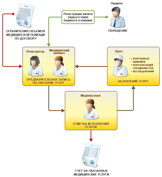 Регистрация факта выполнения медицинских услуг, которые назначила регистратура (регистратурно-диспетчерский отдел), производится в подсистеме «Контроль исполнения» врачебным или средним медицинским персоналом. При регистрации факта выполнения услуги врач может производить назначение повторных приемов, консультаций, исследований, манипуляций, а также регистрировать данные, необходимые для сбора медицинской статистики.